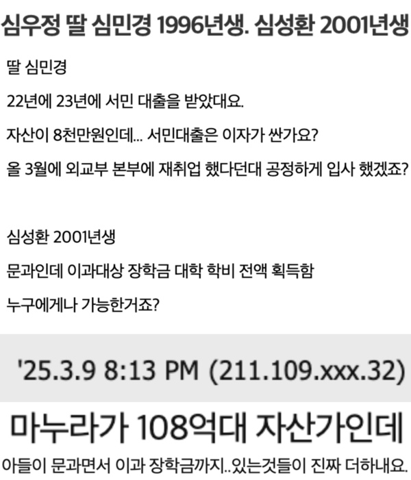2024년 8월 국회 인사청문회 당시 심우정 후보자는 자신과 가족의 재산을 108억 원으로 신고했으며, 김성은 씨가 보유한 부동산 자산이 큰 비중을 차지하는 것으로 드러났다.