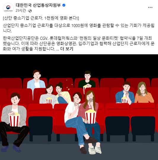 산업부는 올해 산업단지 근로자를 위한 문화 시설 및 프로그램 확충을 위해 '천원의 일상 문화티켓' 프로그램을 영화 외 스포츠·공연·전시 분야로 확대하는 등 지자체, 문화단체와 협력해 문화지원 프로그램을 개발해 나갈 예정이다.