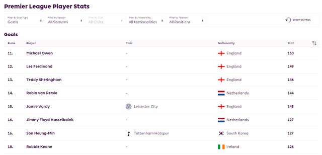 프리미어리그 역사상 손흥민보다 많은 골을 넣은 선수가 단 15명뿐이라는 이야기다. 현재 15위는 143골을 기록한 레스터 시티에서 뛰고 있는 또다른 살아있는 레전드 제이미 바디로, 손흥민이 그를 따라잡기 위해서는 16골이 더 필요하다.