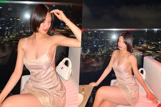 공개된 사진 속 임하은은 싱가포르 마리나베이샌드에서 바라본 야경을 배경으로 포즈를 취하고 있는 모습이다. 은은하게 반짝이는 슬립 미니 원피스를 입은 임하은은 얇디얇은 끈에 의지한 볼륨감으로 시선을 강탈했다. 언뜻 보이는 옆태에는 확 노출된 속살이 드러나 보는 이를 매료했다.