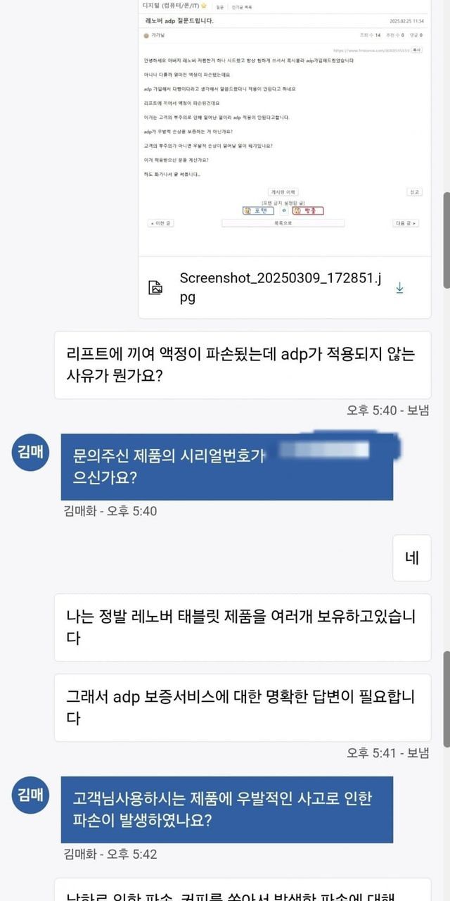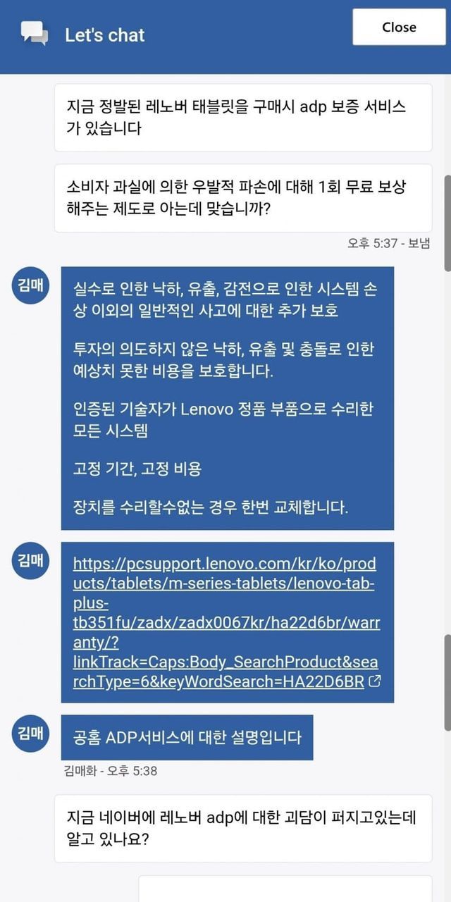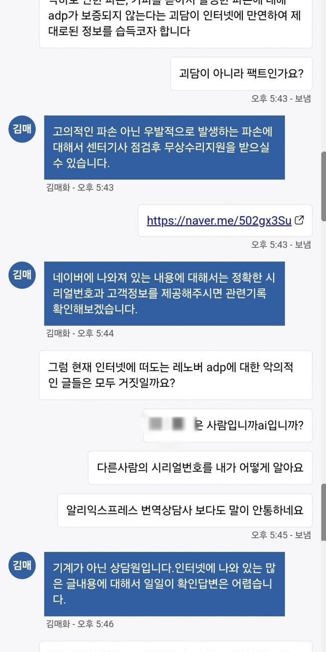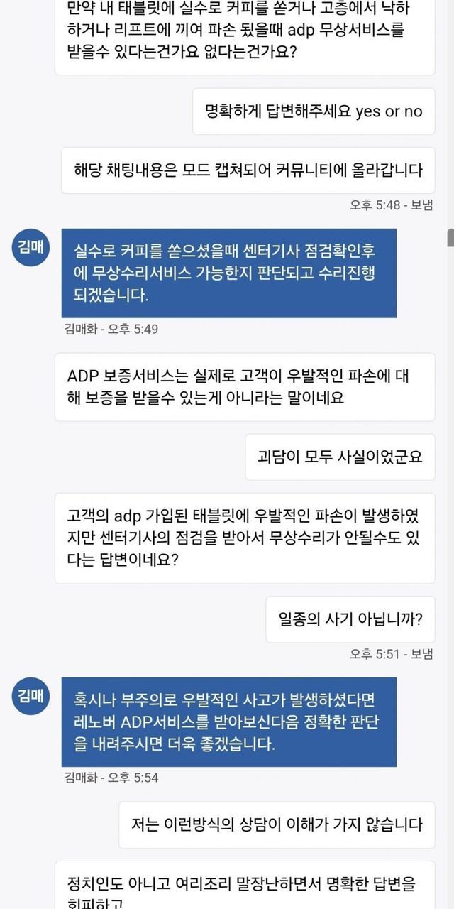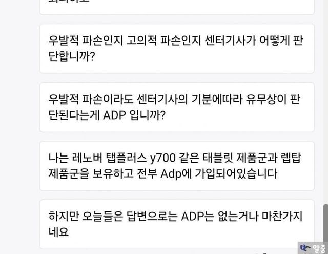 나는 레노버 정발제품도 꽤 많이 구매하였기에, 요즘 커뮤니티에 떠도는 ADP에 대한 괴담이 많이 불편해서 사실을 확인하고자 채팅상담을 시작했다.