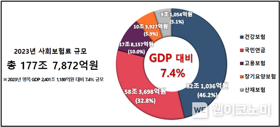 2023년 한해 우리 국민이 부담한 5대 사회보험료는 총 177조 7,872억원에 달한 것으로 집계됐다. 2022년 165조 9,969억원에 비해 11조 7,903억원(7.1%) 증가한 수치다.