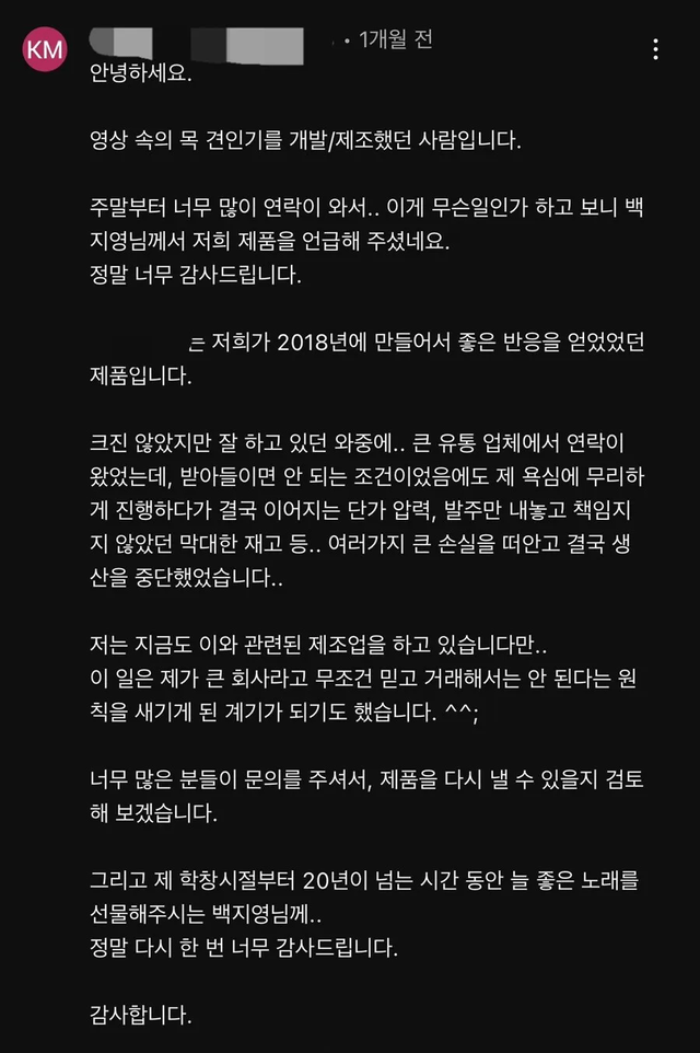 사업파트너 잘못만나서 단종했다가 백지영이 유튜브에서 너무 만족한다고 재생산 요청