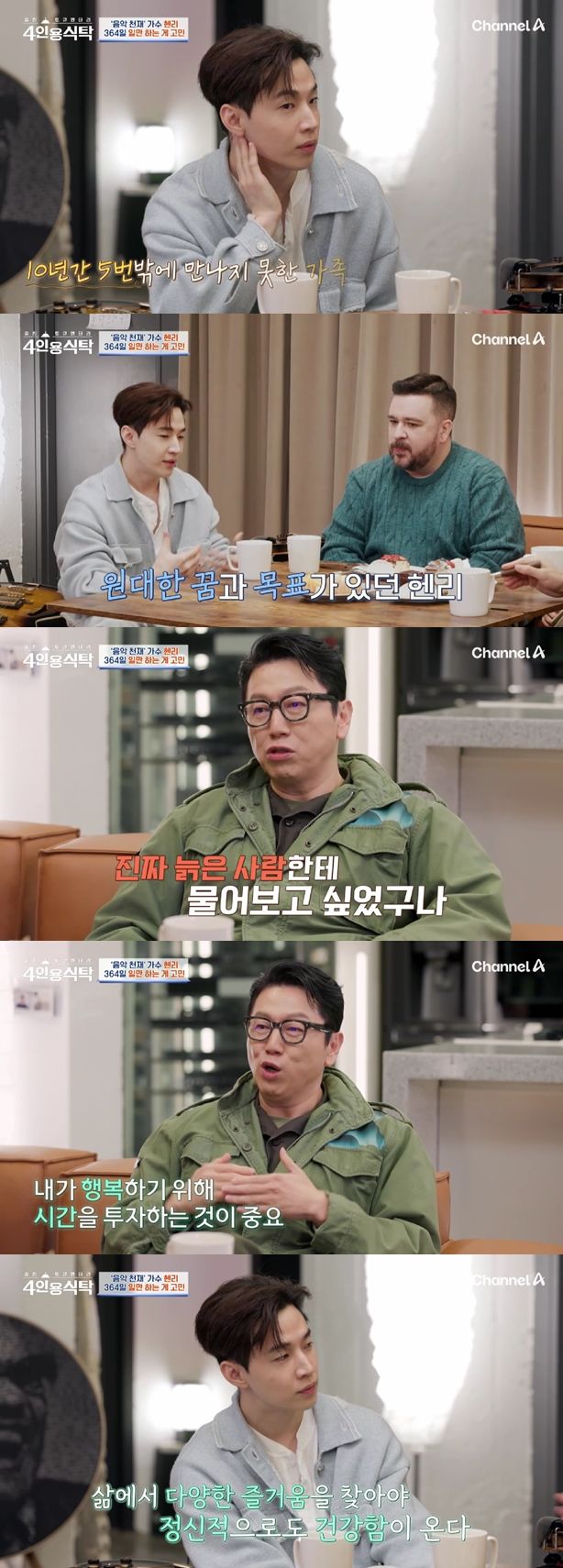 10일 방송된 채널A '절친 토큐멘터리 4인용식탁'(이하 '4인용식탁')에는 가수 헨리가 출연해 배우 김수로, 방송인 샘 해밍턴, 사유리를 초대했다.