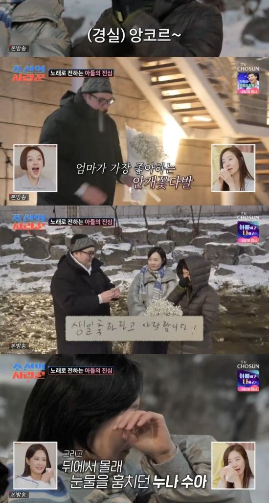 이경실은 기타를 치며 노래하는 손보승을 보고 눈물을 흘렸다. 손보승은 공연을 무사히 마쳤고, 꽃다발과 편지를 건넸다. 이경실은 "엄마가 제일 좋아하는 꽃으로. 고마워, 우리 아들. 추운데 기타 치느라 수고했다. 쑥스러웠을 텐데 고맙다"라며 손보승을 안아줬다.