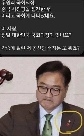 실제 일부 누리꾼들은 우 의장의 배지에 대해 “가슴에 달린 저 공산당 배지는 또 뭐죠?”라며 의혹을 제기했다. 해당 글은 각종 SNS에 공유됐다.