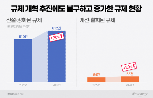 일부 규제가 완화된 점은 긍정적이지만, 전체 규제 증가 폭이 여전히 크다는 점에서 기업들의 부담은 더욱 가중되고 있다. 특히, 전년(2022년) 대비 규제 증가율이 20%를 넘어섰다는 점은 정부가 실질적으로 규제 신설과 강화를 더 활발히 추진하고 있음을 시사한다.