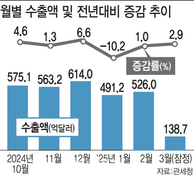 우리 수출이 2개월 연속 상승 흐름이라고는 하지만 트럼프 관세 압력 앞에 불안감은 커지고 있다. 미국은 당장 이달 12일(현지시간) 철강·알루미늄과 볼트, 너트, 스프링 같은 166개 파생상품에 대한 25% 관세 부과를 예고하고 있다. 오는 4월2일(현지시간)에는 주요국을 상대로 상호관세 부과도 예정됐다.