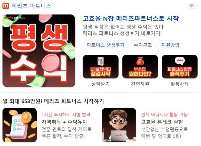 네이버에 메리츠파트너스를 검색했을 때 나오는 광고는 더 심각하다. ‘1시간 투자해서 시험합격’, ‘월 최대 653만원’, ‘고효율 홈테크’라는 문장들은 보험 소비자보다는 설계사 쉬운 진입장벽에 초점이 맞춰져 있다.