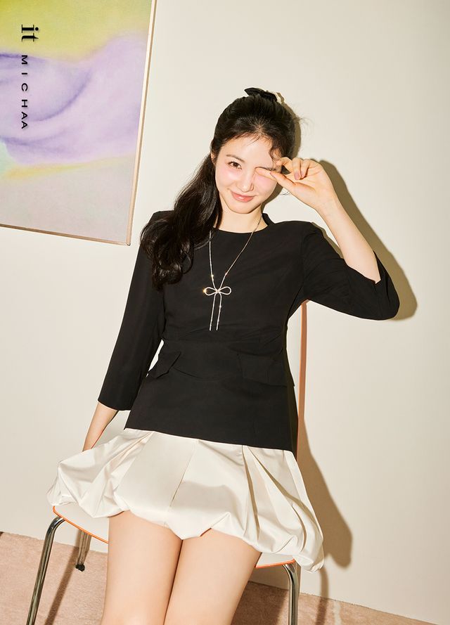 이번 컬렉션에서는 신예은이 영화 말할 수 없는 비밀 쇼케이스에서 착용하며 화제를 모은 스타일링도 포함되어 있다. 블랙 페플럼 블라우스와 화이트 볼륨 스커트는 클래식한 페미닌 무드와 트렌디한 감각을 조화롭게 담아낸 룩이다. 슬림한 블랙 블라우스는 허리를 감싸며 여성스러운 실루엣을 강조하고, 포켓 디테일이 더해져 고급스러움을 배가시킨다.