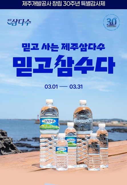 [한라일보] 제주삼다수를 생산·판매하는 제주특별자치도개발공사가 창립 30주년을 맞아 3월 한 달간 제주삼다수 브랜드 기획전 '믿고삼수다'를 진행한다. 제주삼다수는 제주개발공사의 대표 브랜드로 1998년 첫 출시 이후 국내 먹는샘물 시장 1위를 유지하고 있다.