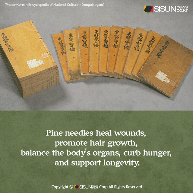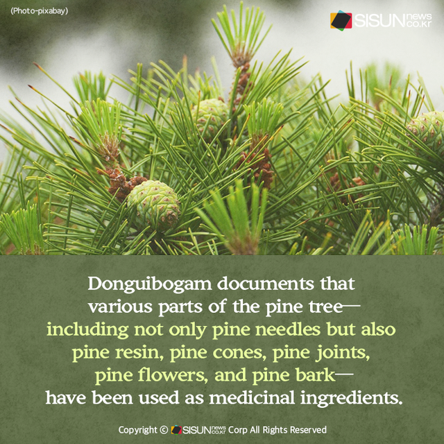 Donguibogam documents that various parts of the pine tree—including not only pine needles but also pine resin, pine cones, pine joints, pine flowers, and pine bark—have been used as medicinal ingredients.