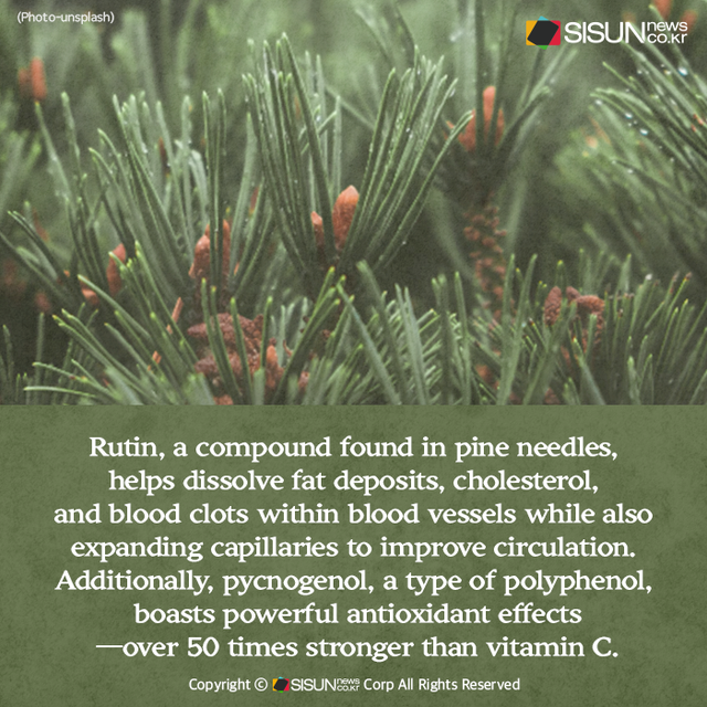 Rutin, a compound found in pine needles, helps dissolve fat deposits, cholesterol, and blood clots within blood vessels while also expanding capillaries to improve circulation. Additionally, pycnogenol, a type of polyphenol, boasts powerful antioxidant effects—over 50 times stronger than vitamin C.