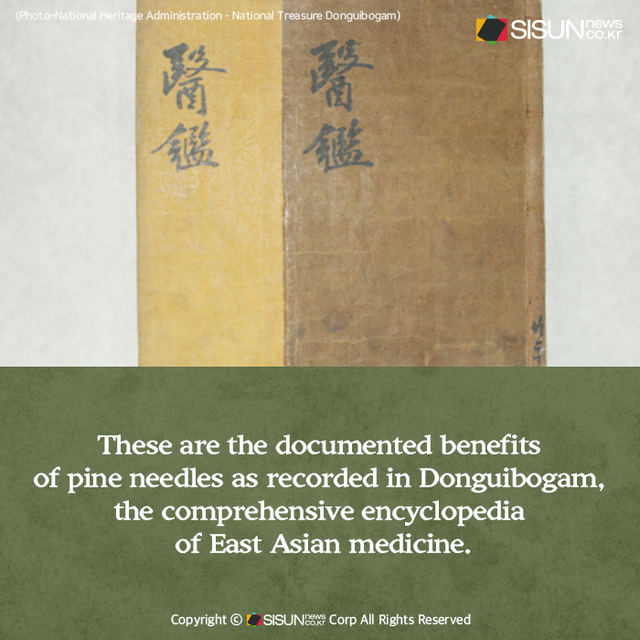 These are the documented benefits of pine needles as recorded in Donguibogam, the comprehensive encyclopedia of East Asian medicine.