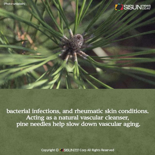 bacterial infections, and rheumatic skin conditions. Acting as a natural vascular cleanser, pine needles help slow down vascular aging.