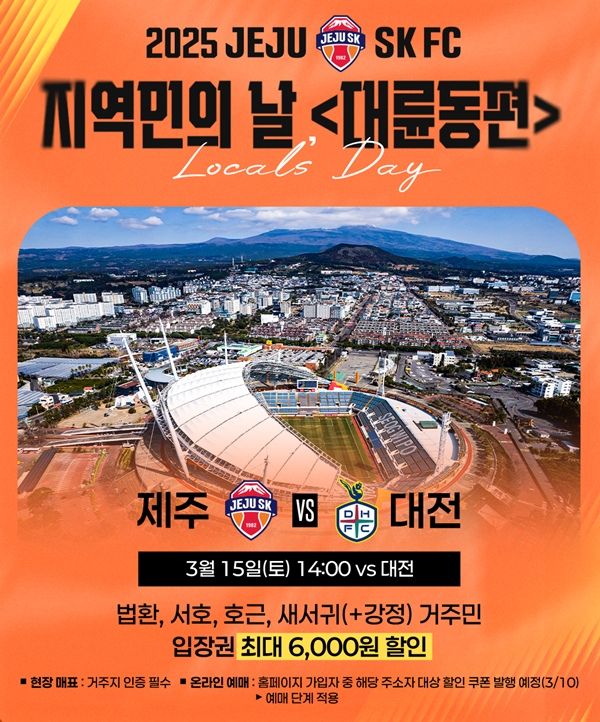 [한라일보] 제주SK FC가 오는 15일을'지역민의 날(Local Day)'로 정하고 제주월드컵경기장에서 열리는 대전하나시티즌과의 K리그1 5라운드 경기 입장권 할인 혜택을 제공한다고 11일 밝혔다.