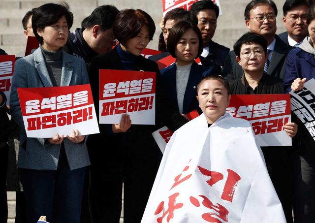 11일 오후 1시 30분 국회 본청 계단 앞에서 민주당 전진숙·박홍배·김문수 의원은 빨간 글씨로 '조기 파면'이라 적힌 가운을 입고 삭발했다. 이들은 헌법재판관들에게 윤 대통령 즉각적인 파면을 요구하며 강한 발언을 이어갔다.
