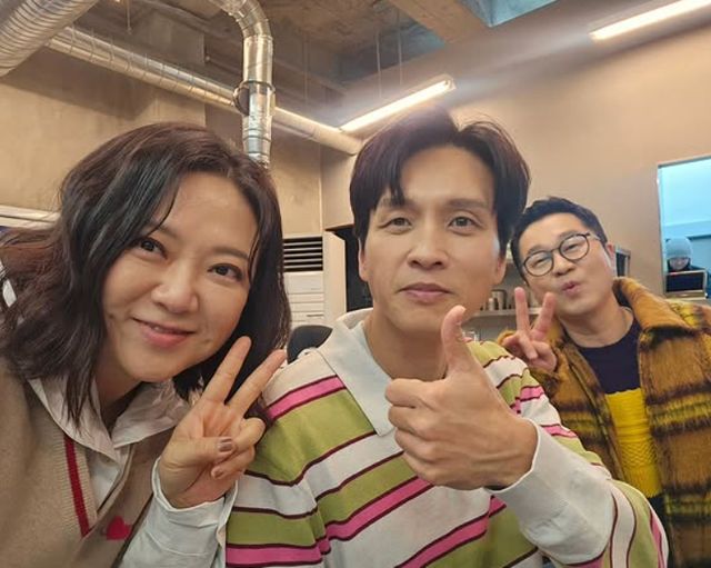 김숙은 구본승의 옆에서 미소를 지으며 브이 포즈를 취하고, 구본승은 엄지손가락을 치켜세운 채 카메라를 응시하고 있다. 두 사람은 다정하게 어깨를 맞대어 친밀한 분위기를 자아낸다.