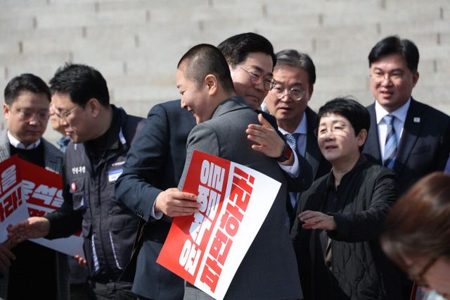 11일 서울 여의도 국회 본청 앞 계단에서 박홍배·김문수·전진숙 더불어민주당 의원이 윤석열 대통령 조기파면 등을 촉구하며 삭발하자 박찬대 민주당 원내대표가 전진숙 의원을 격려하고 있다. ⓒ 연합뉴스