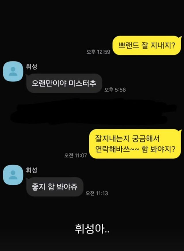캡처본 속 추플렉스는 휘성에게 "잘 지내지?"라며 안부를 물었고, 휘성은 "오랜만이야. 미스터 추"라고 답했다.