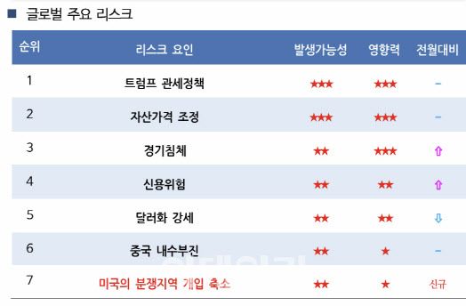 국제금융센터가 지난 10일 발간한 월간 보고서 ‘3월 글로벌 리스크 워치’에 따르면 최근 글로벌 이슈의 가장 큰 화두로 떠오른 ‘미국의 관세부과 영향’이 리스크 요인 1순위로 꼽혔다.