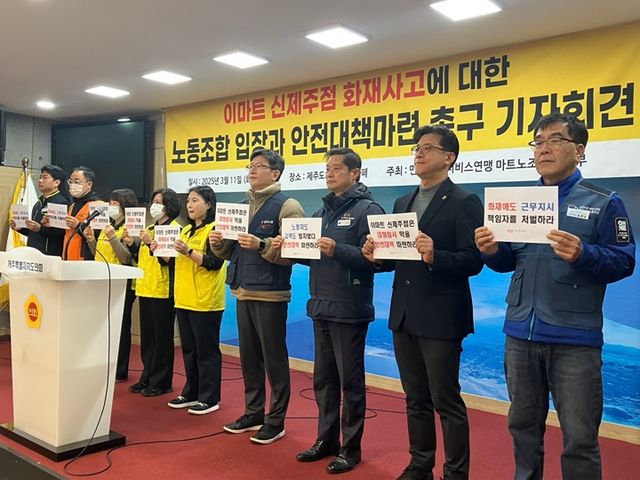 민주노총 서비스연맹 마트산업노동조합 제주본부(이하 본부)는 11일 제주도의회 도민카페에서 기자회견을 열고 "최근 이마트 신제주점에서 일어난 화재사고는 사람의 목숨과 안전보다 회사의 경영이익을 우선으로 하는 이마트의 인식을 적나라하게 보여줬다"면서 "이마트 신제주점은 대형참사 막을 안전대책을 마련하라"고 요구했다.