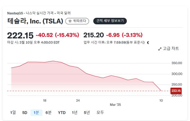 지난 10일 테슬라 주가는 15%가 급락, 2020년 9월 이후 약 4년 만에 최대폭 하락했다.