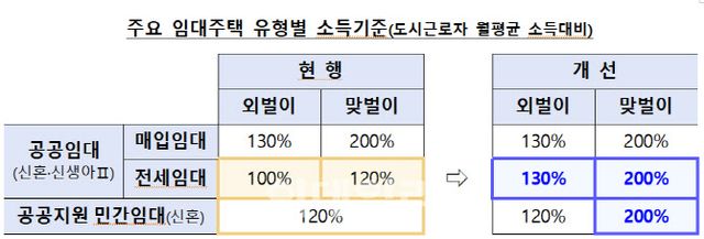 공공임대 주택 중 중산층 신혼·출산가구를 주요 정책대상으로 하는 신혼·신생아Ⅱ 유형의 경우, 전세임대 소득기준을 매입임대와 같은 수준으로 완화해 맞벌이 소득 기준을 도시근로자 월평균 소득 120%에서 200%로 상향한다. 다만 신혼·신생아Ⅰ유형(저소득층 지원), 다자녀가구 유형은 매입임대-전세임대 소득기준이 동일하다.