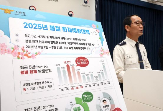 11일 소방청에 따르면 2020~2024년 봄철 화재 발생 건수는 5만2855건으로, 전체의 28%를 차지했다. 계절별로 보면 봄(28%), 겨울(26.7%), 여름(22.8%), 가을(22.5%) 순으로 화재 발생 비중이 높았다.