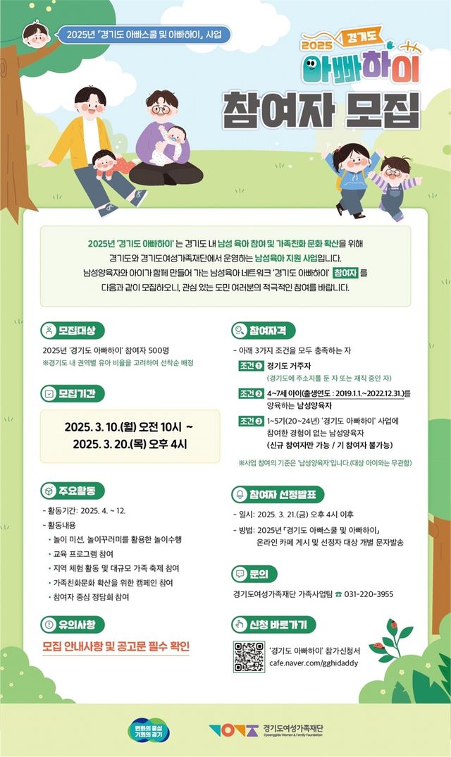 경기도 관계자는 “아빠하이와 아빠스쿨을 통해 남성 양육자들이 보다 적극적으로 육아에 참여하고, 가족과의 관계를 더욱 돈독히 할 수 있도록 지원을 아끼지 않겠다”고 밝혔다.