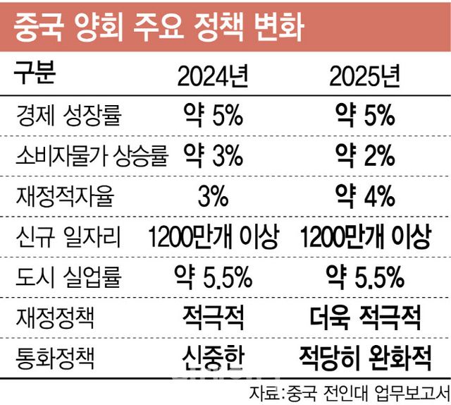 대외 불안정을 해소할 만큼 내수가 취약한 점도 고민이다. 전인대 업무보고는 올해 소비자물가 상승률 목표를 약 2%로 제시해 전년대비 1%포인트 낮췄다. 2023년과 2024년 연간 물가 상승률이 0.2%에 그쳐 목표와 큰 차이가 생기자 수요 부진을 인정하고 눈높이를 내린 것이다.