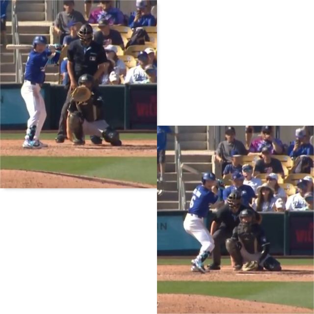 연속 경기 안타가 나온 10일 오클랜드전, 11일 애리조나전에서는 이동발 동작이 또 바뀌었다. 이전에는 지면에 엄지발가락을 찍은 뒤 이를 축으로 움직였다. 현재 그는 그냥 지면에서 발바닥 전체를 떼는 느낌을 주고 있다. 이전에는 오른 발바닥이 2루수 쪽(오른쪽 대각선)을 향했다면, 바뀐 자세에선 1루 쪽을 향하고 있는 것. 더불어 배트는 다시 어깨에 걸친 채 타격을 준비했다. 스탠스도 앞발과 뒷발을 나란히 두는 스퀘어 스탠스에 가까워 보였다. 김혜성은 이 타격 자세로 최근 2경기 정타를 생산했다.김혜성은 개조라고 표현해도 과하지 않을 만큼 타격 자세를 많이 바꿨다. 김하성(탬파베이 레이스), 이정후(샌프란시스코 자이언츠)도 MLB 투수들의 빠른 공 적응을 위해 변화를 줬지만, 김혜성만큼은 아니었다.