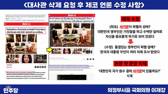 외교부는 지난해 김건희 전 대표에 대한 체코 언론 보도의 삭제 요청에 대해서는 "잘못된 보도를 내보내는 언론사에 대해 적극 대처하는 것은 재외공관의 업무 중 하나"라며 사실과 다른 보도에 대해서는 적극적인 조치를 취하고 있다는 입장을 내놓은 바 있다.