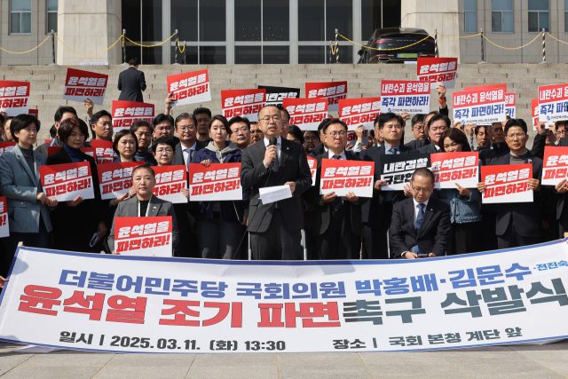 의원들도 일제히 행동에 나섰다. 의원총회에 앞서 이날 박홍배·김문수·전진숙 민주당 의원은 국회 본청 앞 계단에서 삭발식을 단행했다. '윤석열 탄핵 국회의원 연대' 소속인 민주당 박수현·민형배·김준혁·강득구 의원과 윤종오 진보당 의원은 헌재의 신속한 탄핵 인용을 촉구하며 이날부터 윤 대통령 파면 때까지 단식 농성을 시작했다.