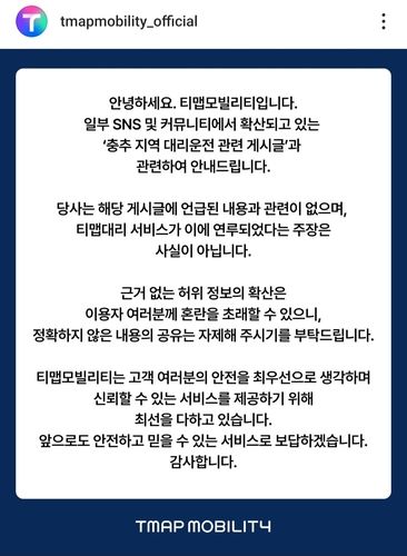 11일 ICT업계에 따르면 티맵모빌리티는 SNS에서 논란이 일고 있는 충북 충주 지역 대리운전 관련 게시글에 관해 "티맵 대리 서비스가 연루됐다는 주장은 사실이 아니다"고 인스타그램에 공지했다.