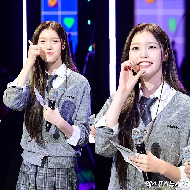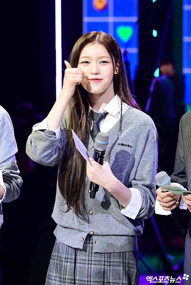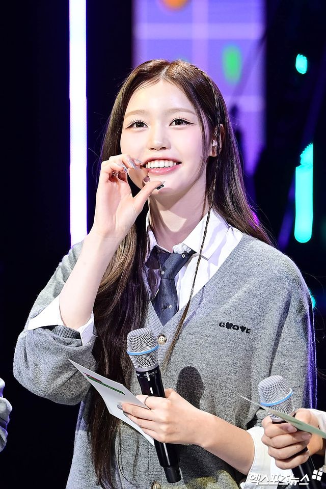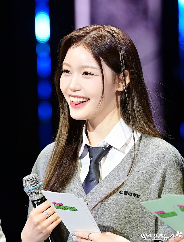 이날 더쇼 생방송에 참석한 이즈나 정세비가 인사하고 있다.