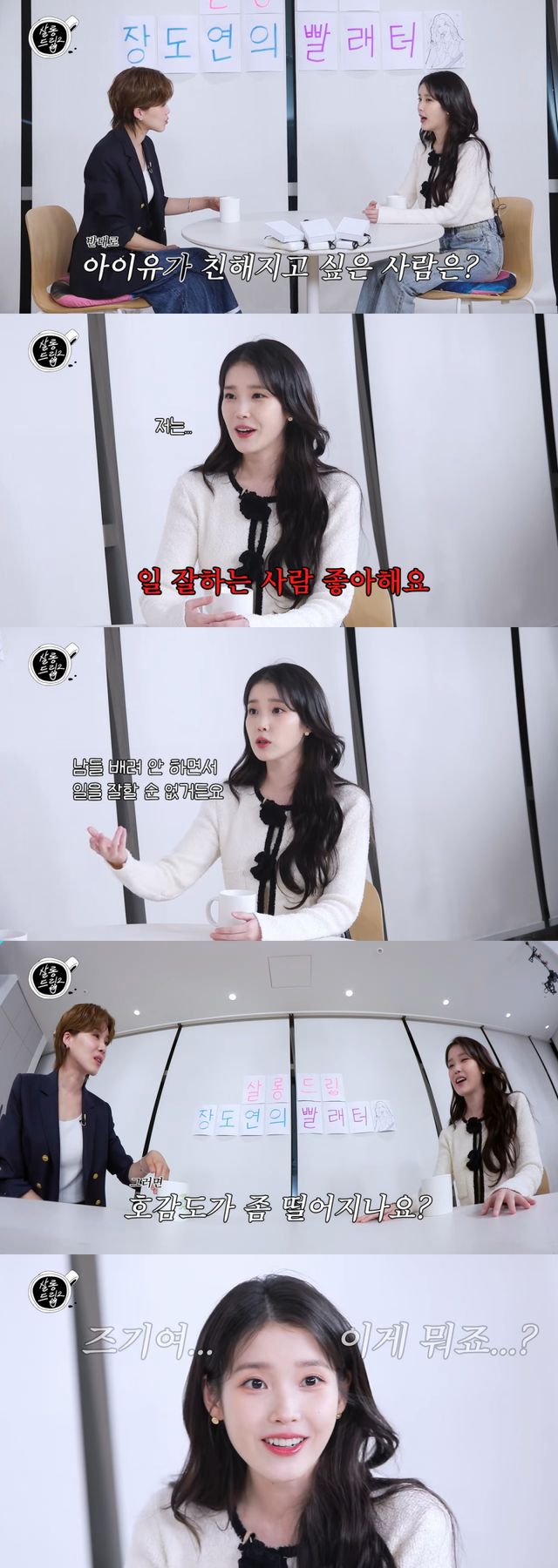 장도연은 “아이유가 친해지고 싶어하는 사람은 누구냐”고 묻자 아이유는 “말은 착한 사람과 친해지고 싶다고 했지만 다른 부분인데 일 잘하는 사람이 좋다”고 대답했다.