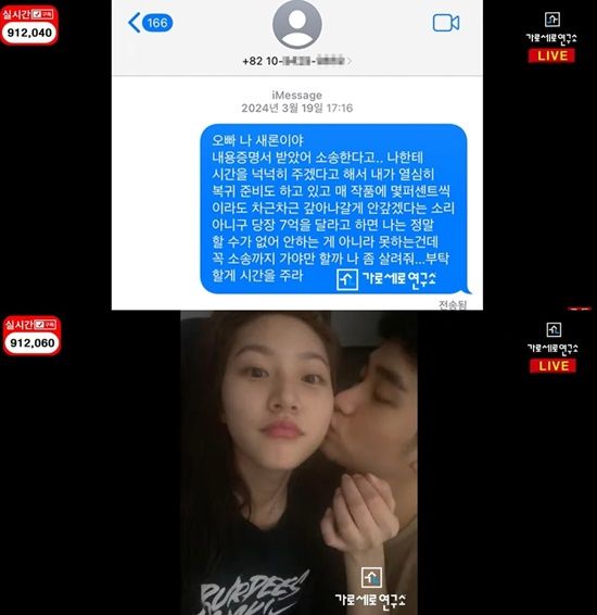 11일 유튜브 채널 가로세로연구소(이하 '가세연')는 이날 오후 실시간 방송을 통해 김새론이 생전 김수현에게 보낸 것으로 알려진 문자 메시지를 공개했다.