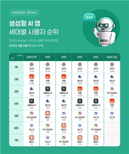 11일 앱·리테일 분석 서비스 와이즈앱·리테일에 따르면 지난 3일부터 9일까지 국내 스마트폰 사용자가 가장 많이, 가장 오래 사용한 생성형 AI 앱은 모든 연령대에서 챗GPT로 나타났다.