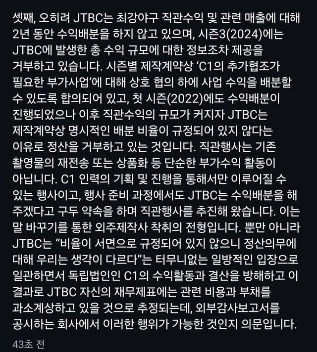 - JTBC는 최근 2년동안 직관수익 정산도 안해줌. 계약상 상호합의로 배분하기로 되어있는데, 시즌1 이후 명시적인 비율 배분내용이 없다고 정산 안함.