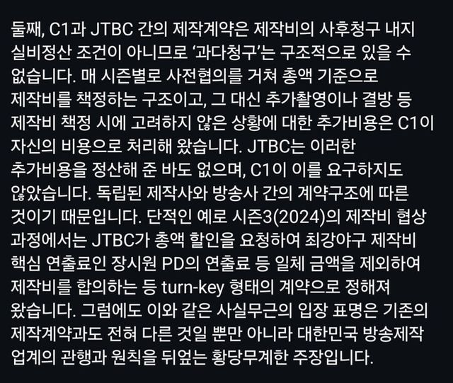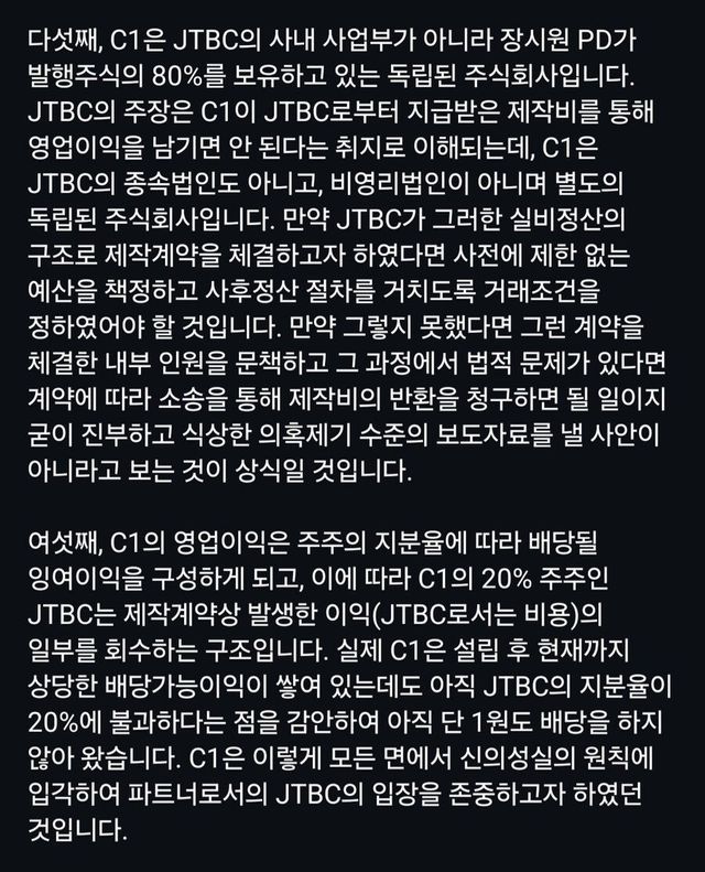 - C1은 JTBC 사내 부서도 아니고 장시원pd가 지분의 80%를 가진 독립된 주식회사. 남는 제작지를 돌려받고싶으면 사전에 계약시 제작비를 무한정 주고, 남는건 돌려받는다고 했어야.