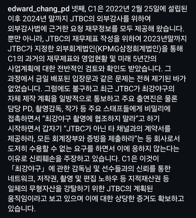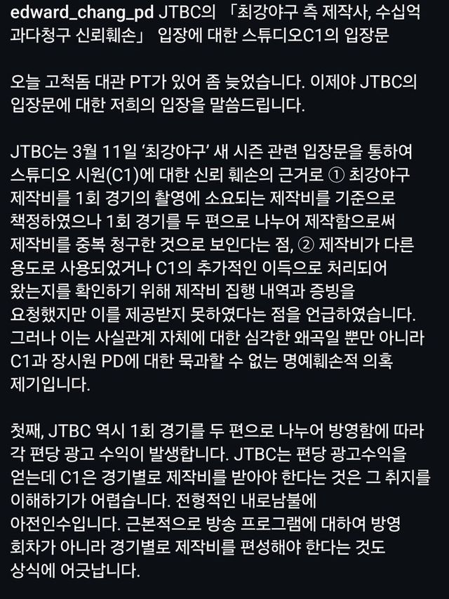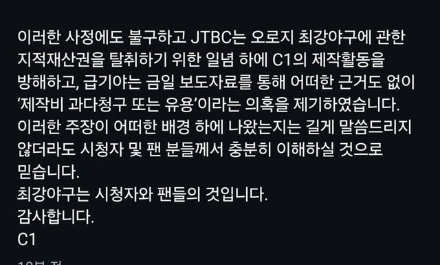 - JTBC도 방송할때 편당 광고비 받으면서 C1만 경기별 제작비를 받는건 내로남불.