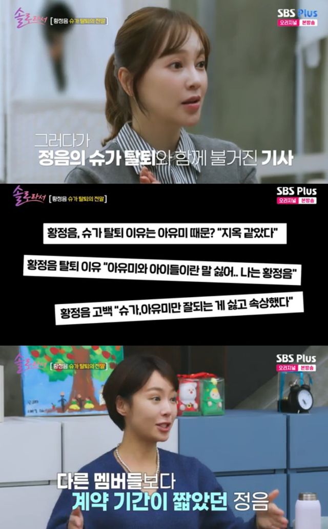 황정음은 “우리만 아는 거지만 난 3년만 계약했다. 계약 기간이 끝나서 탈퇴를 한 것이다. 재계약을 안 했을 뿐”이라며 “사실 그때 우리 슈가를 키워준 건 아유미라서 너무 고마워했고 그 고마움 속에 나 자신 스스로가 작아지는 속상함이 있었던 것”이라고 회상했다. 그러면서 “그거는 태어나서 처음 느껴보는 감정이었고 그걸 감당하기엔 내 그릇이 크지 않았던 것”이라며 “나 스스로한테 기대를 많이 했다. 내 기대보다 이하니까 너무 속상한 거다. 그래서 재계약을 안 한 것 뿐”이라고 설명했다.