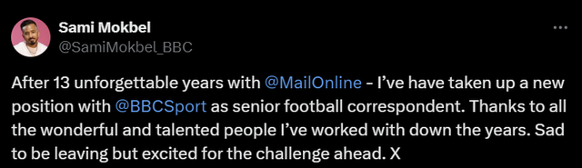 목벨은 "데일리 메일에서 잊을 수 없는 13년을 보낸 뒤 BBC 스포츠에서 수석 축구기자란 새로운 직책을 맡았다"며 "지난 수년간 함께 일한 훌륭하고 재능 있는 모든 사람들에게 감사드린다. 떠나는 것은 슬프지만 앞으로의 도전이 기대가 된다"고 했다.
