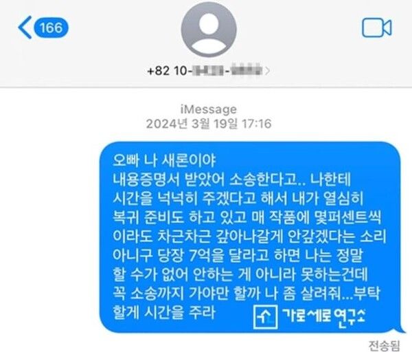 11일 유튜브 채널 가로세로연구소(이하 '가세연')는 이날 오후 실시간 방송을 통해 김새론이 생전 김수현에게 보낸 것으로 알려진 문자 메시지를 공개했다.