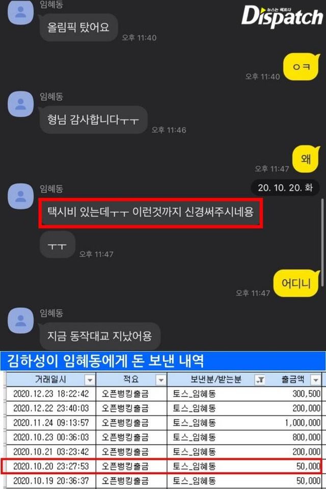 # 김하성은 술 마시고 들어가는 동생이 걱정돼 택시비도 보냈다. 2020년 10월 20일 23시 27분 5만 원 (토스) 입금.