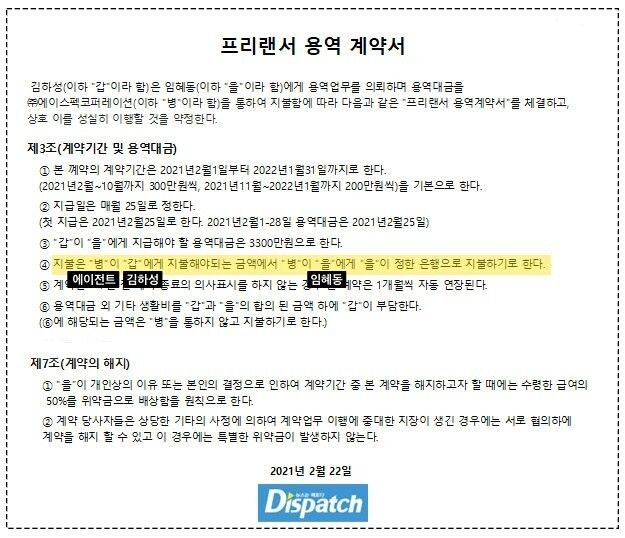 ‘디스패치’는 김하성(갑)과 임혜동(을), 에이스펙(병)이 쓰려고 한 3자 용역 계약서을 확보했다. (하지만 회사 반대로 체결하진 못했다.)