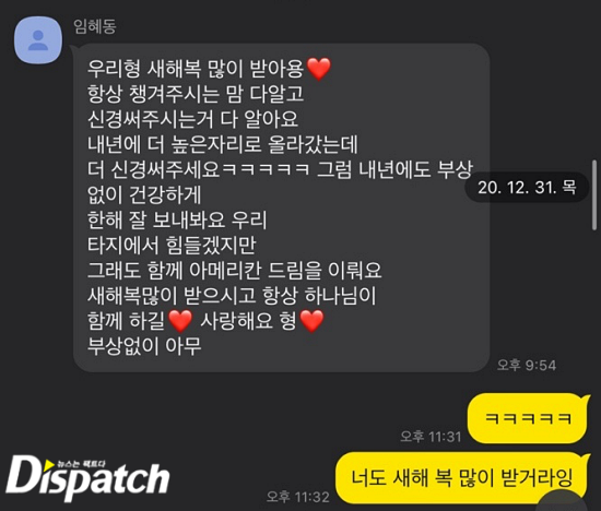 “우리 형 새해 복 많이 받아용. 항상 챙겨주시는 맘 다 알고 신경 써주시는 거 다 알아요. 내년에 더 높은 자리로 올라갔는데 더 신경 써주세요 ㅋㅋㅋㅋㅋ 그럼 내년에도 부상 없이 건강하게 한 해 잘 보내봐요. 우리 타지에서 힘들겠지만 그래도 함께 아메리칸 드림을 이뤄요. 새해 복 많이 받으시고 항상 하나님이 함께하길. 사랑해요 형.”