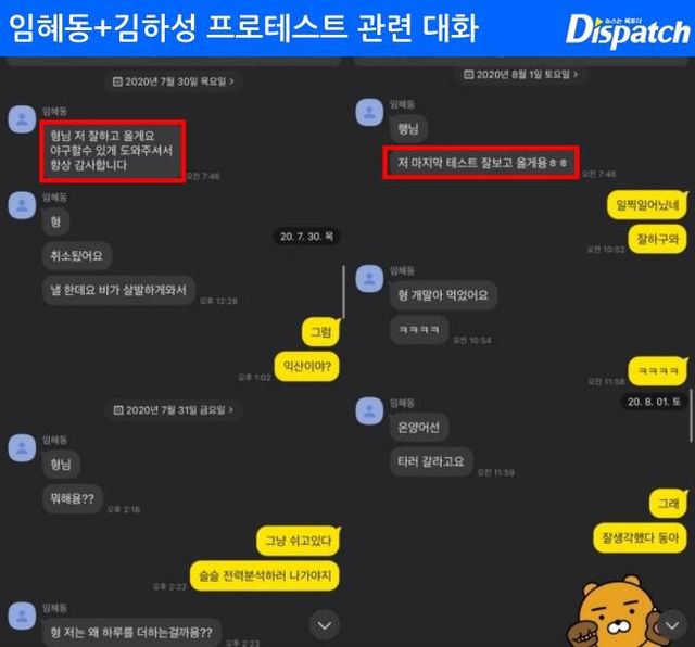 ‘디스패치’ 2020년 7월 30일 카톡을 입수했다. 김하성이 입단 테스트를 주선한 것으로 알려진다.