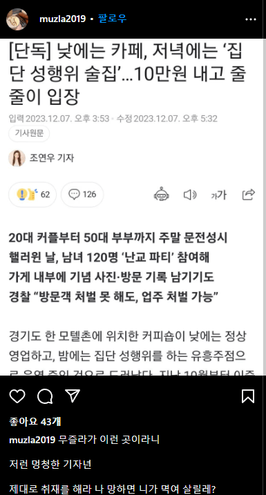 조선일보 조연우 기자님께서 올린 스와핑 클럽으로 지목한 카페는 파주의 ‘무즐라’ 카페
